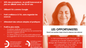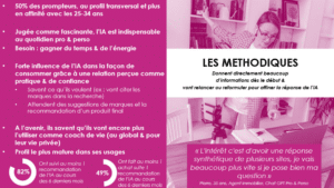 Ils privilégient l’exploration et la conversation : ils donnent peu d’informations au début et vont affiner au fur et à mesure en fonction des réponses des outils IA dont ils apprécient l’aspect conversationnel. L’IA est pour eux un outil d’apprentissage et de découverte, favorisant l’ouverture et l’expérimentation.